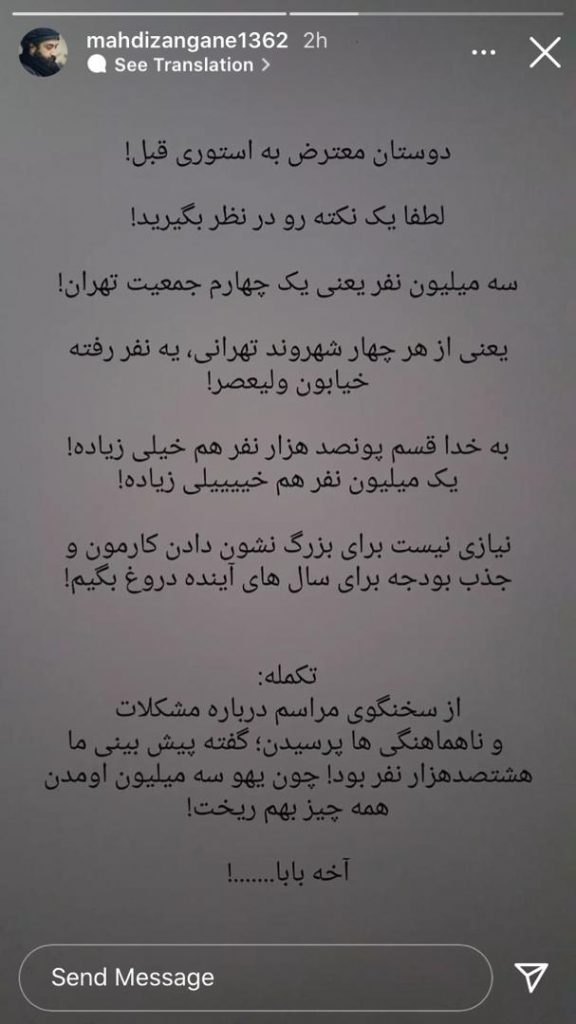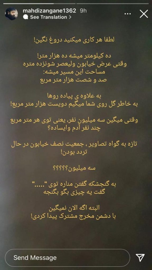 به گزارش پایگاه خبری حاجت نیوز، با توجه به اعلام حضور سه میلیونی مردم مهمانی ده کلیومتری در روز عید غدیر مهدی زنگه مداح و شاعر اهل بیت در صفحه فضای مجازی خود تحت قالب استوریاعتراض خود راه نسبت به حضور این تعداد جمعیت نشان داد و اظهار داشت :
